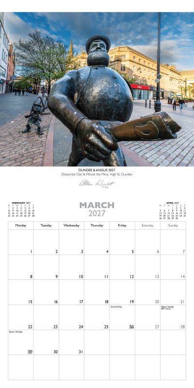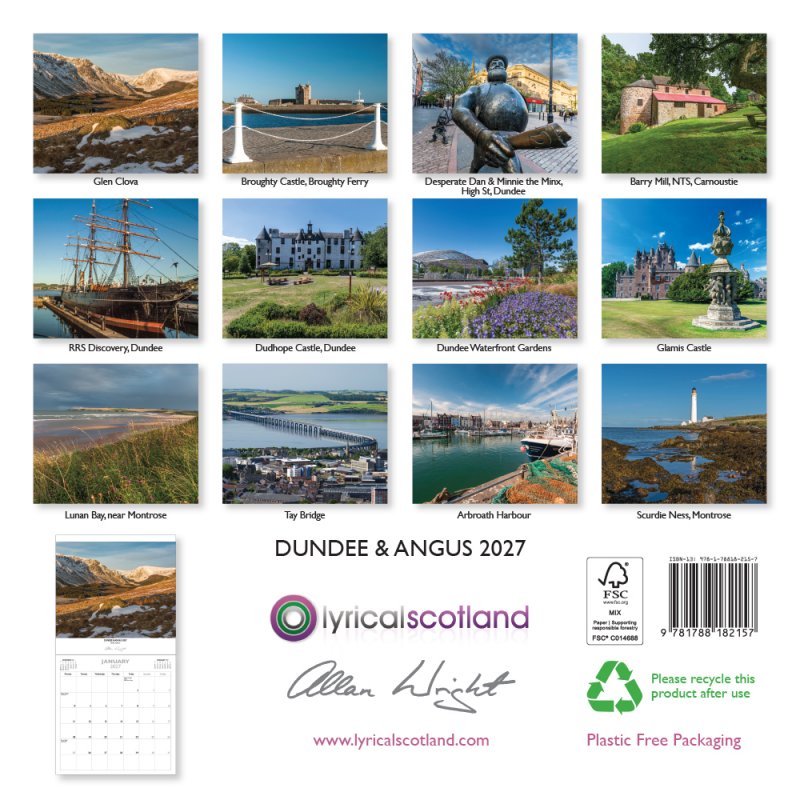 Our 2027 selection of images for Dundee & Angus are: Glen Clova; Broughty Castle, Broughty Ferry; Desperate Dan & Minnie the Minx, High St, Dundee; Barry Mill, NTS, Carnoustie; RRS Discovery, Dundee; Dudhope Castle, Dundee; Dundee Waterfront Gardens; Glamis Castle; Lunan Bay, near Montrose; Tay Bridge; Arbroath Harbour; Scurdie Ness, Montrose. |