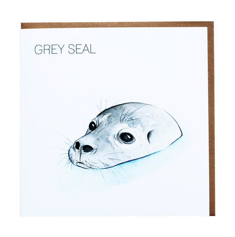 A contemporary watercolour illustration, featuring a grey seal. This card has been left blank inside, for your own personal message.