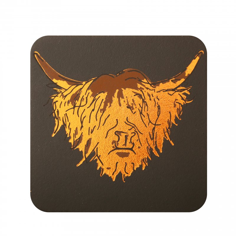 Real leather coaster featuring Highland cow design on black leather with gold foiling.