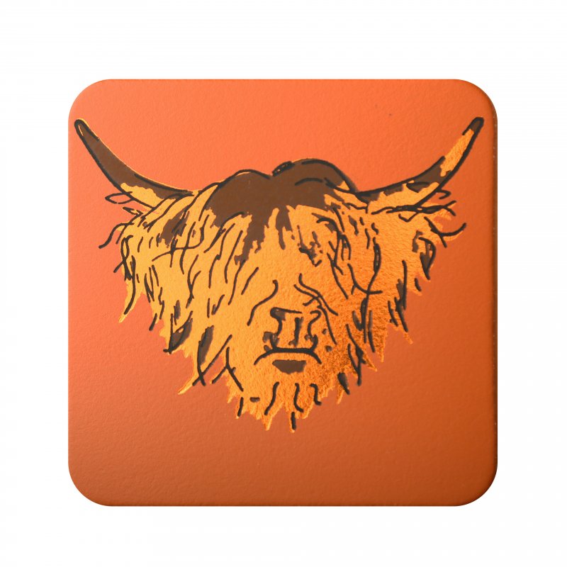 Real leather coaster featuring Highland cow design on tan leather with gold foiling.