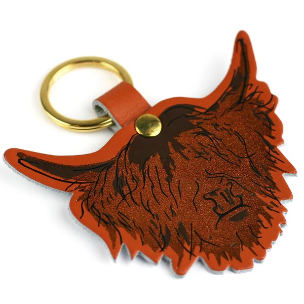 Real leather key ring with Highland cow design on tan leather.
