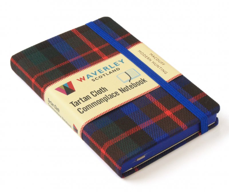 The Waverley Scotland Tartan Cloth Commonplace Notebooks each with 176 pages (left blank, right ruled), acid free, threadsewn, 80gsm cream shade pages, are bound in genuine SCottish tartan cloth over board with round cornered covers and bookblock corners, stained edges and a matching leastic enclosure. Each volume has a ribbon marker and an expandable inner note holder made of cardboard and cloth, and removable booklet with background notes, a Clan Map of Scotland, and with an individual bookmark giving detail on the specific tartan used for the binding.
