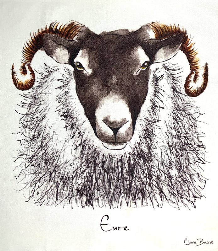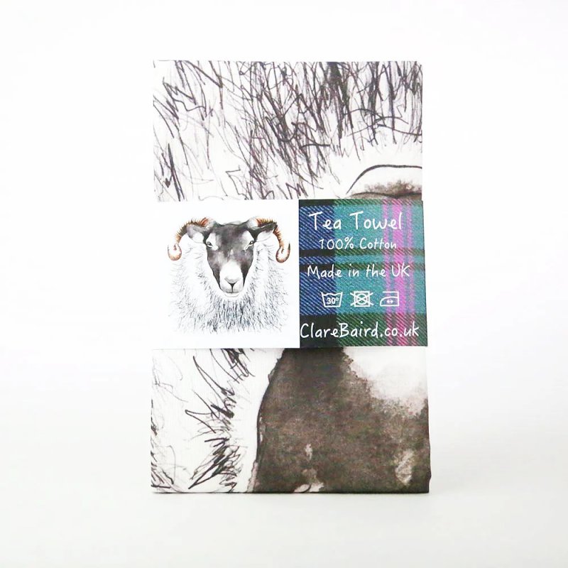 This stunning vibrant & colourful watercolour blackface sheep tea towel design, painted by Scottish artist Clare Baird.