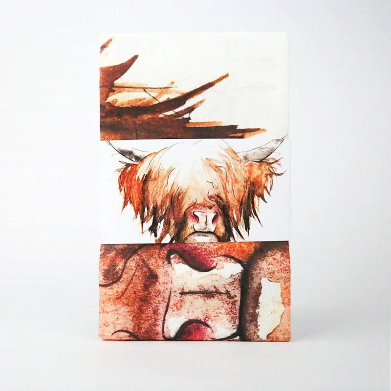 This stunning vibrant & colourful watercolour highland cow tea towel design, painted by Scottish artist Clare Baird.