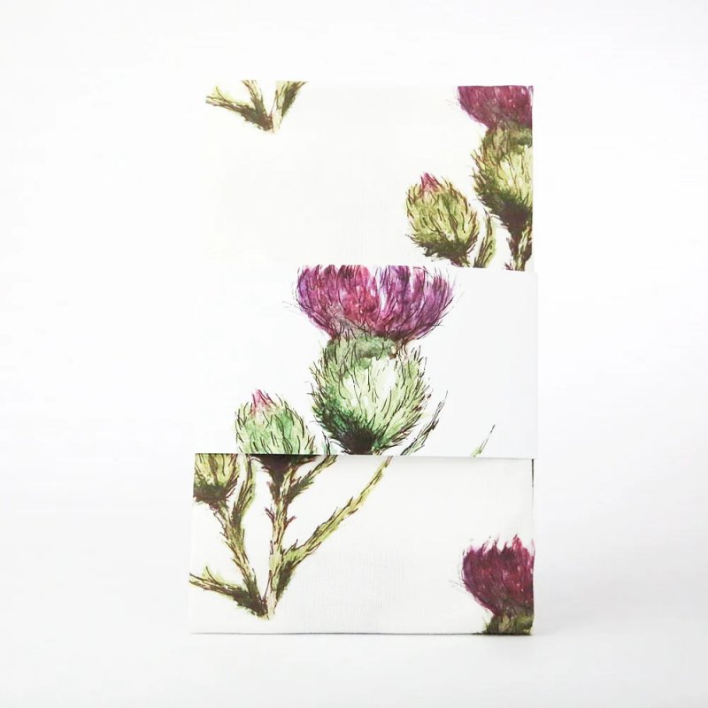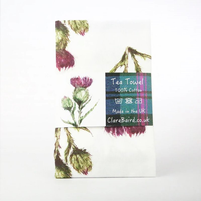 Cotton tea towel featuring a repeating pattern of Scottish artist Clare Baird's vibrant and modern painting. This design features Scottish thistles - the flower of Scotland.