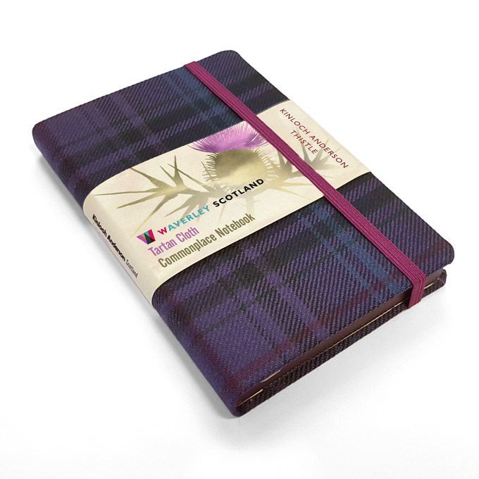The Waverley Scotland Tartan Cloth Commonplace Notebooks each with 176 pages (left blank, right ruled), acid free, threadsewn, 80gsm cream shade pages, are bound in genuine SCottish tartan cloth over board with round cornered covers and bookblock corners, stained edges and a matching leastic enclosure. Each volume has a ribbon marker and an expandable inner note holder made of cardboard and cloth, and removable booklet with background notes, a Clan Map of Scotland, and with an individual bookmark giving detail on the specific tartan used for the binding. |