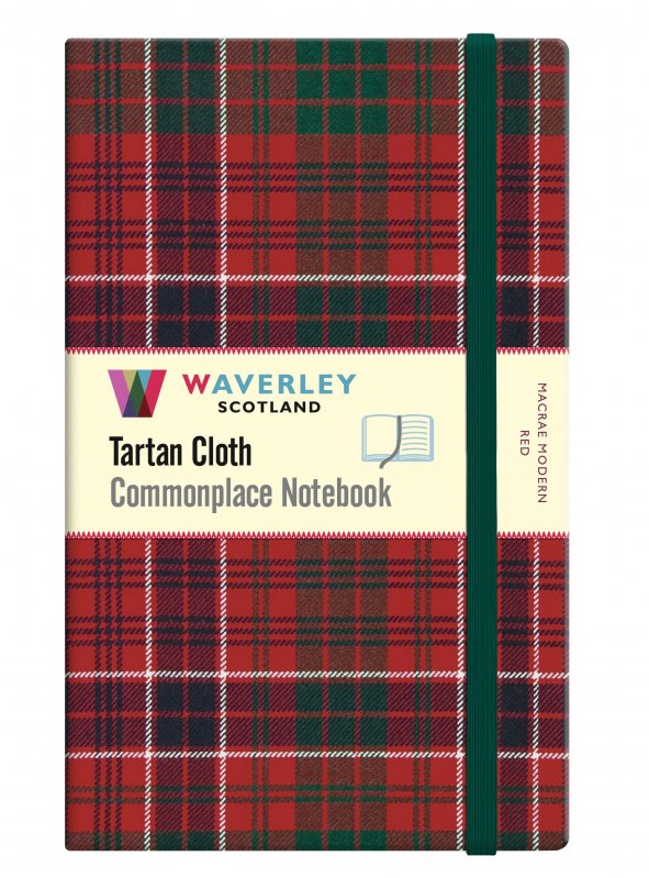 The Waverley Scotland Tartan Cloth Commonplace Notebooks each with 192 pages (left blank, right ruled), acid free, threadsewn, 80gsm cream shade pages, are bound in genuine SCottish tartan cloth over board with round cornered covers and bookblock corners, stained edges and a matching leastic enclosure. Each volume has a ribbon marker and an expandable inner note holder made of cardboard and cloth, and removable booklet with background notes, a Clan Map of Scotland, and with an individual bookmark giving detail on the specific tartan used for the binding.