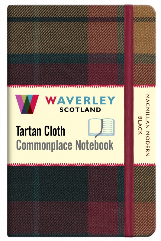 The Waverley Scotland Tartan Cloth Commonplace Notebooks each with 192 pages (left blank, right ruled), acid free, threadsewn, 80gsm cream shade pages, are bound in genuine SCottish tartan cloth over board with round cornered covers and bookblock corners, stained edges and a matching leastic enclosure. Each volume has a ribbon marker and an expandable inner note holder made of cardboard and cloth, and removable booklet with background notes, a Clan Map of Scotland, and with an individual bookmark giving detail on the specific tartan used for the binding.