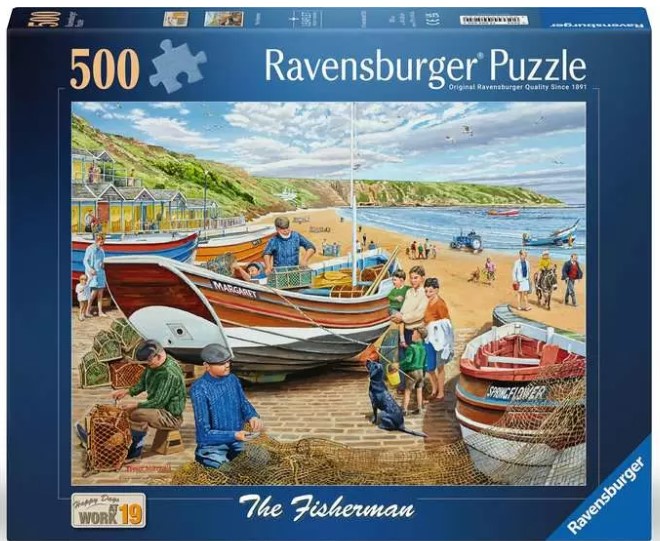 It’s a bright day on the beach at Filey, with local fisherman making the most of the good weather and repairing their nets and preparing for the next fishing trip. Further down the beach another boat is being brought up to shore, a kiddie is enjoying a donkey ride and families stroll along the sand. Despite this being a nostalgic scene, traditional fishing still happens in this picturesque seaside town. High quality 500 piece cardboard jigsaw puzzle. The finished puzzle measures 49 x 36 cm when complete. Suitable for ages 10 years and up. Made from strong premium grade cardboard, with linen finish print to minimise glare on puzzle image. |