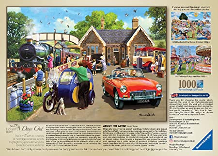 There's a promise of happy times ahead with this scene. Passengers board the waiting train; are they travelling to the next town, the city or even to the coast? In the car park a family is about to continue their journey by bus, a Grandma collects her grand-daughter, and a young couple look forward to spending the day together. There's so much to enjoy in this bright, busy and colourful scene, so create some mindful moments and escape into a world of nostalgia! Includes full colour in-box leaflet with extra puzzle picture for easy reference and artist information. |