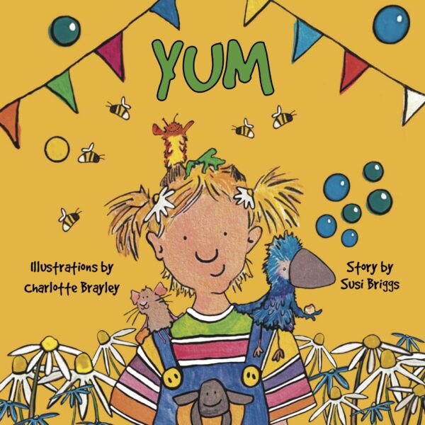 Yum is a delightful story aimed at young children with bright, simple, engaging illustrations. Wee Jenny is in the garden and as she sits down to have her lunch she's joined by an hairy oobit, a craw and a mouse who all like the look of her sandwich. Jenny decides to share what she has with her new friends. |