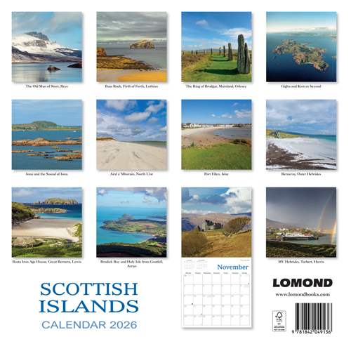 Enjoy wonderful scenic images throughout the year with our range of 2026 calendars. This 24 page wall calendar offers a full page for an image and a full page of date boxes below. The calendar dimensions are 30cm x 30cm (60cm x 30cm when opened). The selection of stunning images of the Scottish Highlands included are: the Old Man of Storr, Isle of Skye; Bass Rock, Firth of Forth, Lothian; the Ring of Brodgar, Mainland, Orkney; Gigha and Kintyre; Iona and the Sound of Iona; Aird a' Mhorain, North Uist; Port Ellen, Islay; Berneray, Outer Hebrides; Bosta Iron Age House, Great Bernera, Isle of Lewis; Brodick Bay and Holy Isle from Goatfell, Arran; Duart Castle, Mull; MV Hebrides, Tarbert, Harris. Our 2026 Lomond Calendars are in plastic free packaging. |