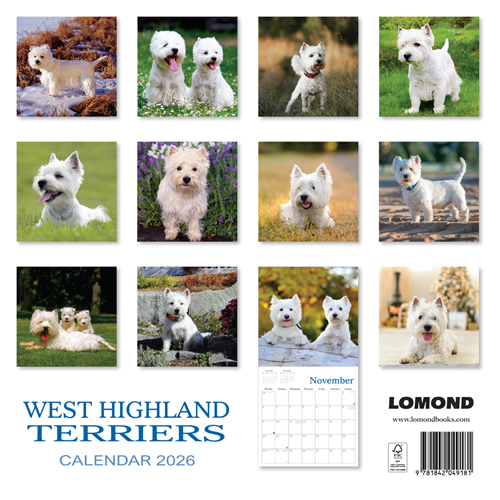 Enjoy wonderful scenic images throughout the year with our range of 2026 calendars. This 24 page wall calendar offers a full page for an image and a full page of date boxes below. The calendar dimensions are 30cm x 30cm (60cm x 30cm when opened). Featuring a wonderful collection of the tremendously popular dog breed, the West Highland Terrier. Our 2026 Lomond Calendars are in plastic free packaging. |