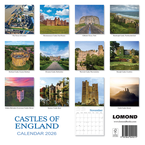 Enjoy wonderful scenic images throughout the year with our range of 2026 calendars. This 24 page wall calendar offers a full page for an image and a full page of date boxes below. The calendar dimensions are 30cm x 30cm (60cm x 30cm when opened). The selection of stunning images of English Castles included are: Tower of London; Herstmonceux Castle, East Sussex; Clifford's Tower, York; Bamburgh Castle, Northumberland; Durham Castle, County Durham; Elvaston Castle, Derbyshire; Warwick Castle, Warwickshire; Sizergh Castle, Cumbria; Haldon Belvedere (Lawrence Castle), Devon; Scotney Castle, Kent; Orford Castle, Suffolk; Corfe Castle, Dorset. Our 2026 Lomond Calendars are in plastic free packaging. |