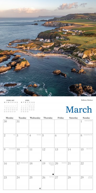 Enjoy wonderful scenic images throughout the year with our range of 2026 calendars. This 24 page wall calendar offers a full page for an image and a full page of date boxes below. The calendar dimensions are 30cm x 30cm (60cm x 30cm when opened). The selection of stunning images of Northern Ireland included are: Hare's Gap, Mournes; the Peace Bridge, Derry-Londonderry; Ballintoy Harbour; Torr Head, Part-Aleen Bay; the Giant's Causeway; Dunluce Castle; Navan Fort, Armagh; Downhill Strand, Castlerock; Slemish Mountain, Ballymena; the Dark Hedges, Stranocum; Blackhead Lighthouse, Belfast Lough; Enniskillen Castle, Lough Erne. Our 2026 Lomond Calendars are in plastic free packaging. |