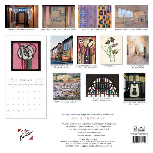 From renowned Scottish photographer Colin Baxter, our range of calendars are fantastic additions to any home or office. This is a 24 page engagement style wall calendar, opening to double size with a full page image on the top and a date box grid below for note taking. The calendar's dimensions are 30cm x 30cm (60cm x 30cm when opened). Our 2026 range come in plastic-free packaging. Colin's selection of stunning images for our Charles Rennie Mackintosh calendar are: Hallway at the Mackintosh House; Wall Stencils and Panels at the Hill House; Wave Pattern, Purple and Black; Drawing Room at the Mackintosh House; Glasgow School of Art, North Face; Silk Embroidered Hanging, the Hill House; Fritillaria, 1915; Main Bedroom, the Hill House; Door Detail from Windyhill, Kilmacolm; Port Vendres, La Ville, 1926; West-Facing Window, Queen's Cross Church; Fireplace and Wall Stencils, 78 Derngate. |