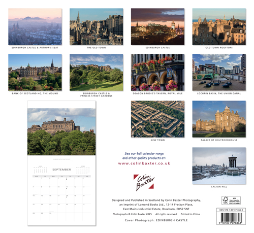 From renowned Scottish photographer Colin Baxter, our range of calendars are fantastic additions to any home or office. This is a 24 page engagement style wall calendar, opening to double size with a full page image on the top and a date box grid below for note taking. The calendar's dimensions are 28cm x 30.5cm (56cm x 30.5cm when opened). Our 2026 range come in plastic-free packaging. Colin's selection of stunning images of Edinburgh are: Edinburgh Castle and Arthur's Seat; the Old Town; Edinburgh Castle at night; Bank of Scotland HQ, The Mount; Edinburgh Castle and Princes Street Gardens; Old Town Rooftops; Deacon Brodie's Tavern, Royal Mile; Lochrin Basin, Union Canal; Edinburgh Castle from the south; the New Town; Palace of Holyroodhouse; Calton Hill. |