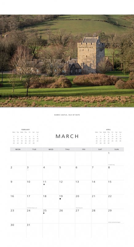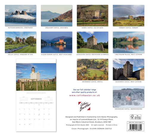 From renowned Scottish photographer Colin Baxter, our range of calendars are fantastic additions to any home or office. This is a 24 page engagement style wall calendar, opening to double size with a full page image on the top and a date box grid below for note taking. The calendar's dimensions are 28cm x 30.5cm (56cm x 30.5cm when opened). Our 2026 range come in plastic-free packaging. Colin's selection of stunning images of Scottish castles are: Ruthven Barracks, Strathspey; Urquhart Castle, Loch Ness; Kames Castle, Isle of Bute; Tarbert Castle, Tarbert; Kellie Castle, Kingdom of Fife; Eilean Donan Castle, West Highlands; Lochleven Castle, Perthshire and Kinross; Linlithgow Palace, West Lothian; Inveraray Castle, Argyll; Blackness Castle, West Lothian; Craigievar Castle, Aberdeenshire; Kinnaird Head Castle and Lighthouse, Fraserburgh, Aberdeenshire. |