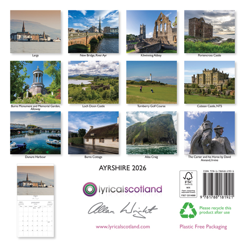 Featuring spectacular photography by Allan Wright, our range of 2026 calendars lets you bring Scotland in all its beauty into your home for the whole year. Our Lyrical Scotland range are 24 page wall calendars, offering a full page for the image and a full page for date boxes below. This range are supplied in plastic free envelopes suitable for posting, which can be opened to enclose a card or message and then resealed before sending. Our 2026 selection of images for Ayrshire are: Largs; New Bridge, River Ayr; Kilwinning Abbey; Portencross Castle; Burns Monument and Memorial Garden, Alloway; Loch Doon Castle; Turnberry Golf Course; Culzean Castle, NTS; Dunure Harbour; Burns Cottage; Ailsa Craig; The Carter and his Horse, Irvine. Calendar dimensions are 24cm x 24cm (48cm x 24cm when opened). |